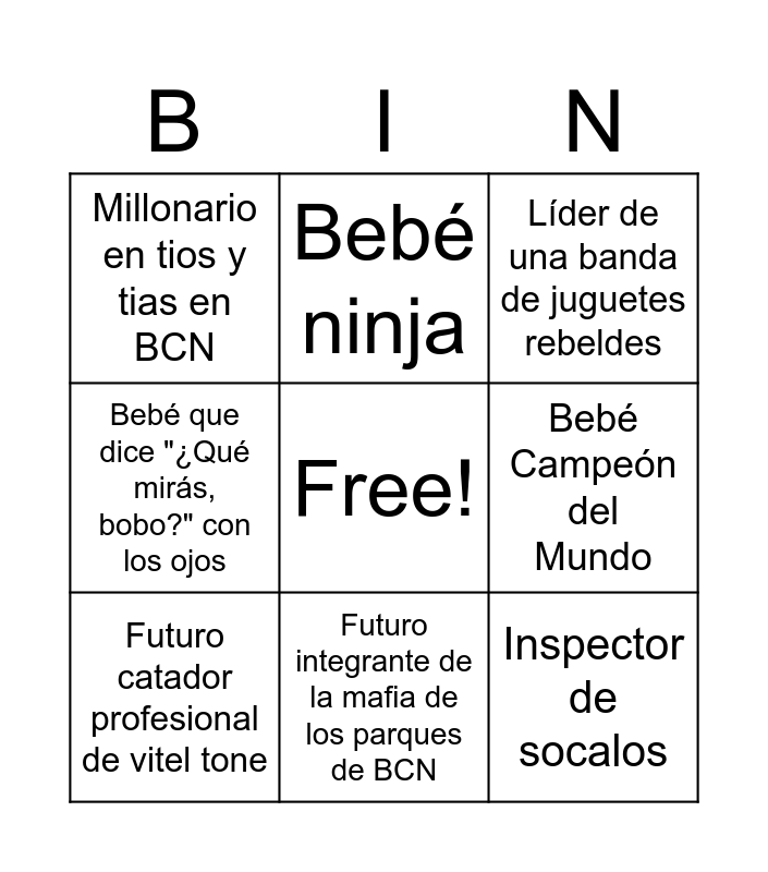 This bingo card has a free space and 27 words: Modelo de rulos hermosos, Futuro Rey del Karaoke, Bebe Rockero, Bebe Inluencer, Bebé Campeón del Mundo, Líder de una banda de juguetes rebeldes, Bebé ninja, Mini bailarín de cumbia, Futuro campeón de Tetris, Futuro experto de crash, Corredor profesional de Mario Kart, Bebé que dice "¿Qué mirás, bobo?" con los ojos, Campeón de siestas, Bebe barrabrava de River, Futuro intendente de las Flores, Futuro tricampeón olimpico del tutifrutis, Futuro catador profesional de vitel tone, Futuro integrante de la mafia de los parques de BCN, Mini campeón de lucha libre, Millonario en tios y tias en BCN, Futuro catador de chipás, Bebé bailarín de reggaetón, Futuro asistente de asados en badalona, Futuro moderador del grupo de los pibes tanos, Futuro catador de lemon pie de quito, Inspector de socalos and Futuro contrabandista de juguestes por wallapop.