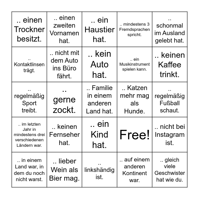 This bingo card has 27 words: Free!, .. gleich viele Geschwister hat wie du., .. ein Musikinstrument spielen kann., .. linkshändig ist., .. Kontaktlinsen trägt., .. ein Haustier hat., .. einen zweiten Vornamen hat., .. im letzten Jahr in mindestens drei verschiedenen Ländern war., .. Katzen mehr mag als Hunde., .. nicht bei Instagram ist., .. regelmäßig Sport treibt., .. mindestens 3 Fremdsprachen spricht., .. in einem Land war, in dem du noch nicht warst., .. lieber Wein als Bier mag., .. keinen Kaffee trinkt., .. mehr als 20 km vom Büro entfernt wohnt., .. nicht mit dem Auto ins Büro fährt., .. kein Auto hat., .. keinen Fernseher hat., .. einen Trockner besitzt., .. regelmäßig Fußball schaut., .. auf einem anderen Kontinent war., .. gerne zockt., .. Familie in einem anderen Land hat., .. ein Kind hat., .. schonmal im Ausland gelebt hat. and .. schon mal ein System komplett geschrottet hat..