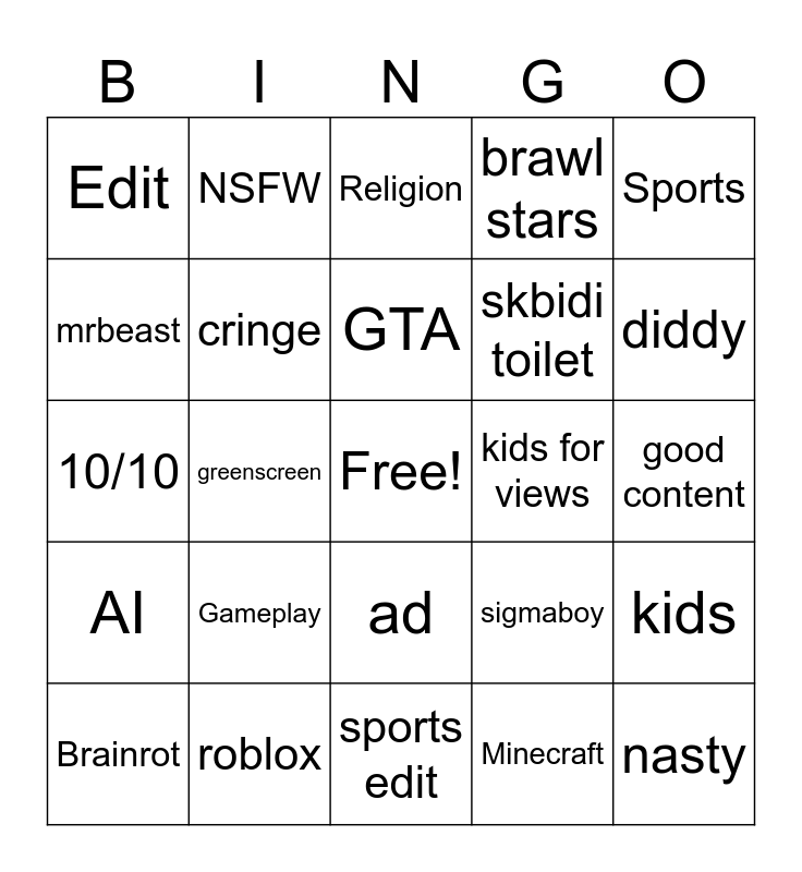 This bingo card has a free space and 24 words: Brainrot, Gameplay, GTA, Minecraft, Sports, Edit, NSFW, Religion, kids for views, good content, 10/10, cringe, sigmaboy, kids, mrbeast, roblox, sports edit, brawl stars, diddy, AI, greenscreen, ad, skbidi toilet and nasty.