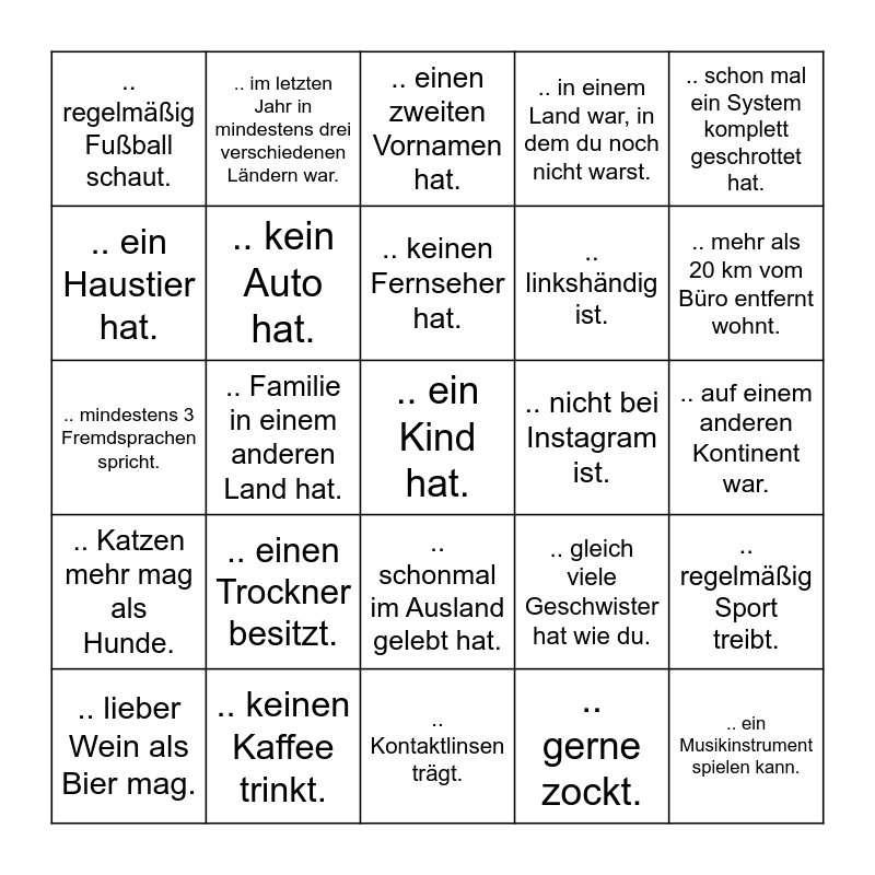 This bingo card has 27 words: .. gleich viele Geschwister hat wie du., .. ein Musikinstrument spielen kann., .. linkshändig ist., .. Kontaktlinsen trägt., .. ein Haustier hat., .. einen zweiten Vornamen hat., .. im letzten Jahr in mindestens drei verschiedenen Ländern war., .. Katzen mehr mag als Hunde., .. nicht bei Instagram ist., .. regelmäßig Sport treibt., .. mindestens 3 Fremdsprachen spricht., .. in einem Land war, in dem du noch nicht warst., .. lieber Wein als Bier mag., .. keinen Kaffee trinkt., .. mehr als 20 km vom Büro entfernt wohnt., .. nicht mit dem Auto ins Büro fährt., .. kein Auto hat., .. keinen Fernseher hat., .. einen Trockner besitzt., .. regelmäßig Fußball schaut., .. auf einem anderen Kontinent war., .. gerne zockt., .. Familie in einem anderen Land hat., .. ein Kind hat., .. schonmal im Ausland gelebt hat., .. schon mal ein System komplett geschrottet hat. and .. schon mal einen Klostein geklaut hat..