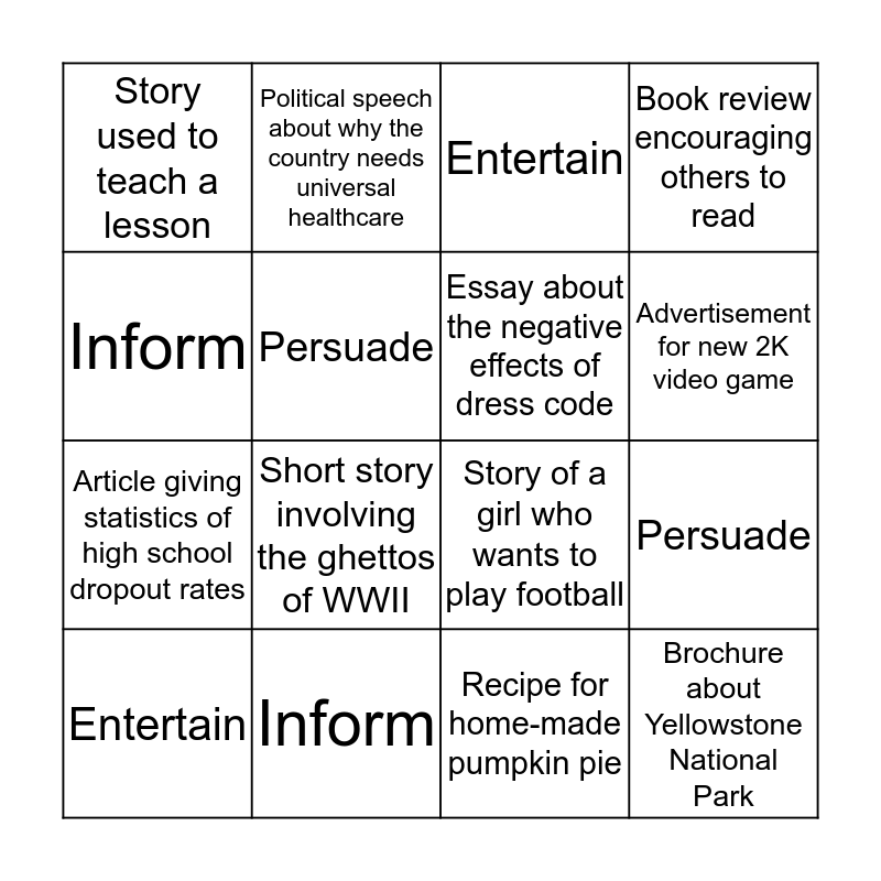 This bingo card has 16 words: Inform, Persuade, Entertain, Story used to teach a lesson, Article giving statistics of high school dropout rates, Political speech about why the country needs universal healthcare, Story of a girl who wants to play football, Recipe for home-made pumpkin pie, Inform, Persuade, Entertain, Book review encouraging others to read, Short story involving the ghettos of WWII, Advertisement for new 2K video game, Essay about the negative effects of dress code and Brochure about Yellowstone National Park.