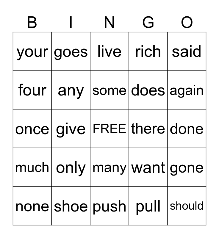 This bingo card has a free space and 24 words: only, shoe, some, none, said, your, four, goes, there, many, does, once, want, gone, any, pull, done, live, again, give, should, much, rich and push.