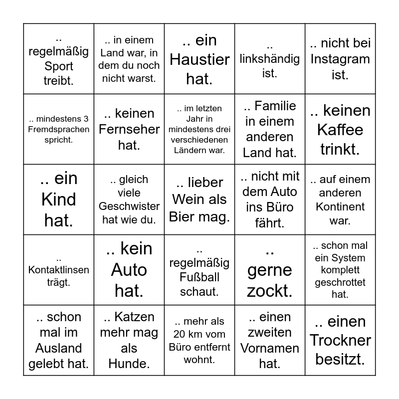 This bingo card has 26 words: .. regelmäßig Fußball schaut., .. einen zweiten Vornamen hat., .. im letzten Jahr in mindestens drei verschiedenen Ländern war., .. Katzen mehr mag als Hunde., .. nicht bei Instagram ist., .. regelmäßig Sport treibt., .. mindestens 3 Fremdsprachen spricht., .. in einem Land war, in dem du noch nicht warst., .. auf einem anderen Kontinent war., .. gerne zockt., .. Familie in einem anderen Land hat., .. ein Kind hat., .. schon mal ein System komplett geschrottet hat., .. schon mal im Ausland gelebt hat., .. gleich viele Geschwister hat wie du., .. ein Musikinstrument spielen kann., .. linkshändig ist., .. Kontaktlinsen trägt., .. ein Haustier hat., .. lieber Wein als Bier mag., .. keinen Kaffee trinkt., .. mehr als 20 km vom Büro entfernt wohnt., .. nicht mit dem Auto ins Büro fährt., .. kein Auto hat., .. keinen Fernseher hat. and .. einen Trockner besitzt..