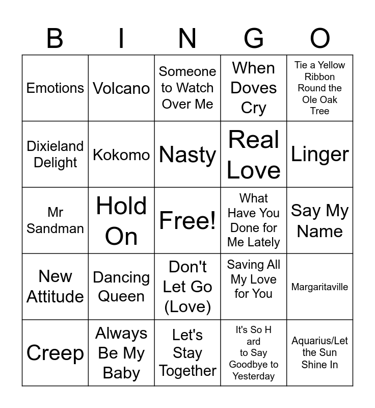 This bingo card has a free space and 49 words: Blackbird, Aquarius/Let the Sun Shine In, A Pirates Look at Forty, Let's Stay Together, Dancing Queen, You're the One That I Want, Volcano, 1999, Dixieland Delight, 99 Luftballons, Kokomo, When Doves Cry, Margaritaville, Saving All My Love for You, Greatest Love of All, Beyond the Sea, Nasty, What Have You Done for Me Lately, Man in the Mirror, Tie a Yellow Ribbon Round the Ole Oak Tree, Hold On, It's So Hard to Say Goodbye to Yesterday, Emotions, Real Love, What's Up?, Linger, Creep, Waterfalls, Don't Let Go (Love), New Attitude, My Heart Will Go On, Man! I Feel Like a Woman!, I Don't Want to Miss a Thing, O Holy Night, Always Be My Baby, The Warrior, We Like to Party! (The Vengabus), Genie in a Bottle, Say My Name, Looking for the Perfect Beat, Funkytown, Tom's Diner, P.Y.T. (Pretty Young Thing), Stand By Me, Mr Sandman, Someone to Watch Over Me, La Vie en Rose, Come Together and In the Air Tonight.