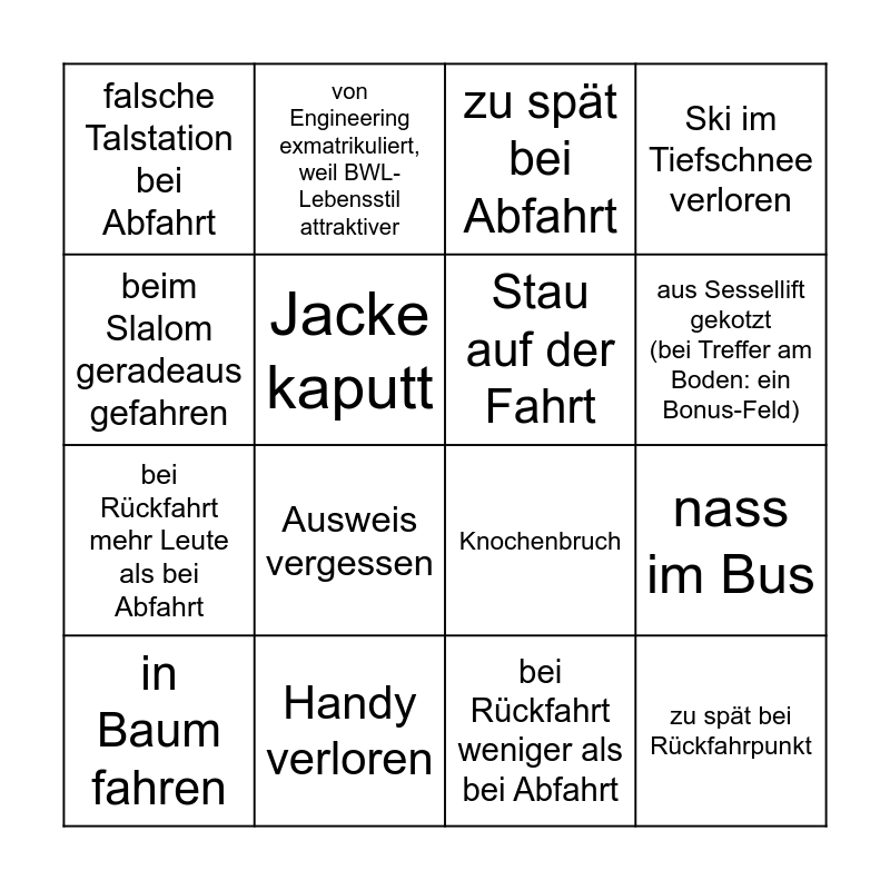 This bingo card has 18 words: Ausweis vergessen, zu spät bei Rückfahrpunkt, zu spät bei Abfahrt, falsche Talstation bei Abfahrt, Knochenbruch, Ski im Tiefschnee verloren, in Baum fahren, von Engineering exmatrikuliert, weil BWL-Lebensstil attraktiver, aus Sessellift gekotzt (bei Treffer am Boden: ein Bonus-Feld), bei Rückfahrt mehr Leute als bei Abfahrt, bei Rückfahrt weniger als bei Abfahrt, beim Slalom geradeaus gefahren, nass im Bus, Jacke kaputt, Stau auf der Fahrt, aller Schnaps weg, Handy verloren and Busfahrer lost.