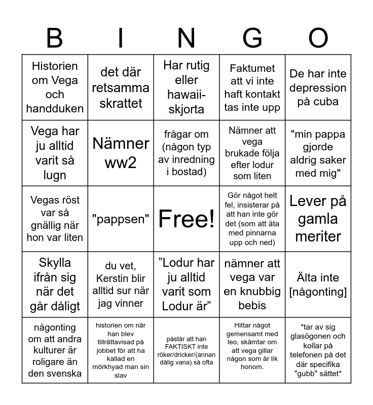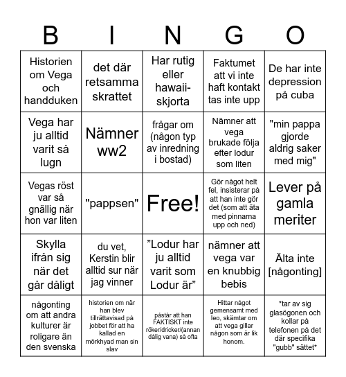 This bingo card has a free space and 24 words: du vet, Kerstin blir alltid sur när jag vinner, historien om när han blev tillrättavisad på jobbet för att ha kallad en mörkhyad man sin slav, frågar om (någon typ av inredning i bostad), någonting om att andra kulturer är roligare än den svenska, De har inte depression på cuba, Historien om Vega och handduken, Vega har ju alltid varit så lugn, det där retsamma skrattet, Gör något helt fel, insisterar på att han inte gör det (som att äta med pinnarna upp och ned), ”Lodur har ju alltid varit som Lodur är”, Nämner att vega brukade följa efter lodur som liten, Vegas röst var så gnällig när hon var liten, nämner att vega var en knubbig bebis, Älta inte [någonting], Nämner ww2, Hittar något gemensamt med leo, skämtar om att vega gillar någon som är lik honom., Lever på gamla meriter, Har rutig eller hawaii-skjorta, "min pappa gjorde aldrig saker med mig", "pappsen", *tar av sig glasögonen och kollar på telefonen på det där specifika "gubb" sättet*, Skylla ifrån sig när det går dåligt, Faktumet att vi inte haft kontakt tas inte upp and påstår att han FAKTISKT inte röker/dricker/(annan dålig vana) så ofta.