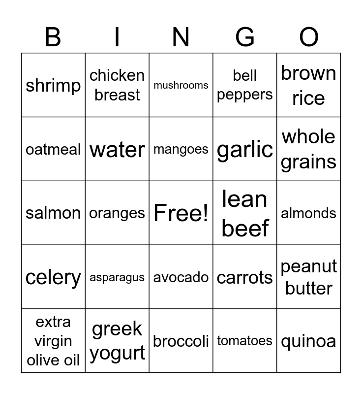 This bingo card has a free space and 29 words: extra virgin olive oil, strawberries, oranges, cilantro, shrimp, mushrooms, water, asparagus, lean beef, greek yogurt, almonds, quinoa, broccoli, tomatoes, whole grains, apples, avocado, celery, brown rice, salmon, carrots, kale, garlic, oatmeal, bell peppers, chicken breast, peanut butter, mangoes and lemon.