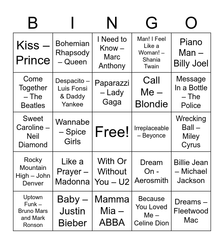 This bingo card has a free space and 50 words: As It Was – Harry Styles, Baby – Justin Bieber, …Baby One More Time – Britney Spears, Because You Loved Me – Celine Dion, Billie Jean – Michael Jackson, Blinding Lights – The Weeknd, Bohemian Rhapsody – Queen, Brown Eyed Girl – Van Morrison, Call Me – Blondie, Can’t Stop The Feeling – Justin Timberlake, Come Together – The Beatles, Despacito – Luis Fonsi & Daddy Yankee, Dream On - Aerosmith, Dreams – Fleetwood Mac, Drive – Incubus, Gimme Shelter – The Rolling Stones, I Need to Know – Marc Anthony, Irreplaceable – Beyonce, I Walk the Line – Johnny Cash, Kiss – Prince, Like a Prayer – Madonna, Mamma Mia – ABBA, Man! I Feel Like a Woman! – Shania Twain, Message In a Bottle – The Police, Midnight Train to Georgia – Gladys Knight & The Pips, Never Gonna Give You Up – Rick Astley, Paparazzi – Lady Gaga, Physical – Olivia Newton-John, Piano Man – Billy Joel, Rocky Mountain High – John Denver, Rolling in the Deep – Adele, Shake It Off – Taylor Swift, Shape of You – Ed Sheeran, Since U Been Gone – Kelly Clarkson, Sir Duke – Stevie Wonder, Smells Like Teen Spirit – Nirvana, Stand By Me – Ben E King, Stayin Alive – Bee Gees, Suspicious Minds – Elvis Presley, Sweet Caroline – Neil Diamond, Sweet Child O’ Mine – Guns N’Roses, This Love – Maroon 5, A Thousand Miles – Vanessa Carlton, Tiny Dancer – Elton John, Uptown Funk – Bruno Mars and Mark Ronson, Wannabe – Spice Girls, With Or Without You – U2, Wonderwall – Oasis, Wrecking Ball – Miley Cyrus and You Make My Dreams – Hall & Oates.