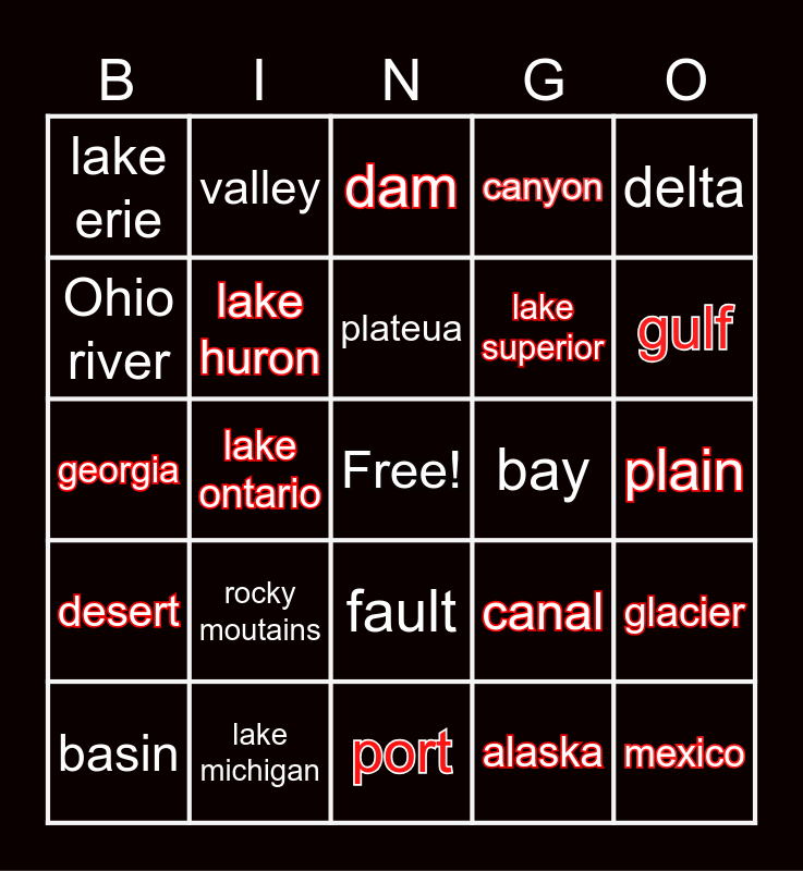 This bingo card has a free space and 24 words: rocky moutains, lake michigan, plateua, basin, delta, lake erie, Ohio river, valley, bay, fault, lake superior, georgia, canal, glacier, lake huron, alaska, plain, dam, gulf, lake ontario, mexico, desert, canyon and port.