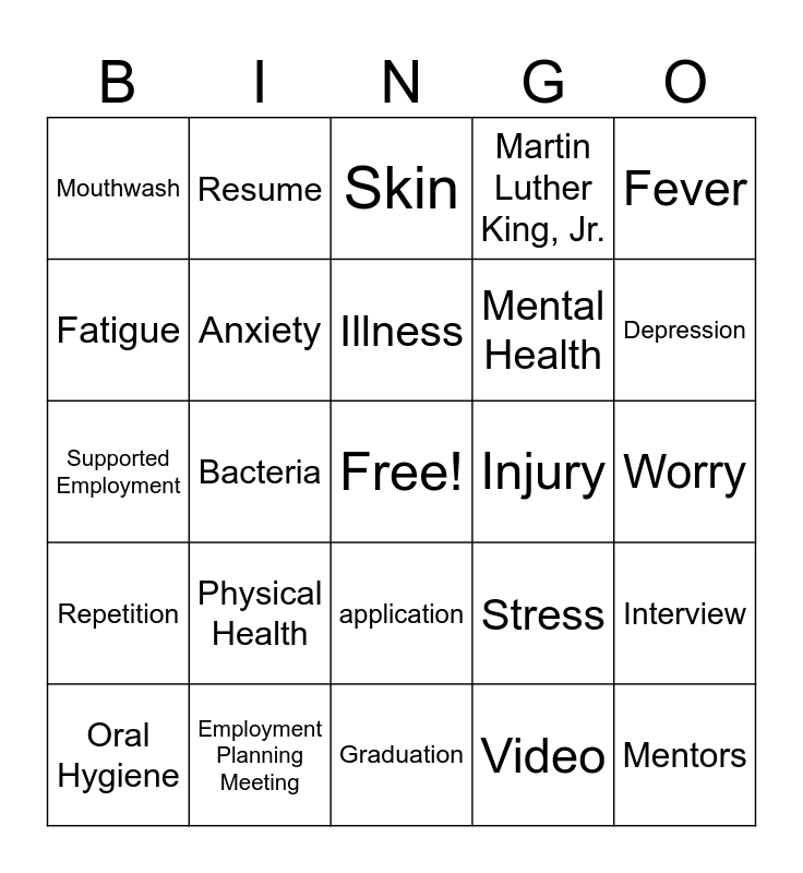 This bingo card has a free space and 24 words: Physical Health, Employment Planning Meeting, Illness, Oral Hygiene, Fever, Mouthwash, Fatigue, Resume, Injury, application, Mental Health, Supported Employment, Stress, Interview, Anxiety, Video, Worry, Skin, Depression, Bacteria, Mentors, Repetition, Martin Luther King, Jr. and Graduation.