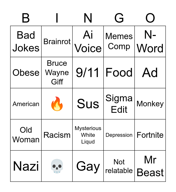 This bingo card has a free space and 24 words: Racism, 💀, 9/11, Nazi, N-Word, Bad Jokes, Obese, Brainrot, Sigma Edit, Mysterious White Liqud, Food, American, Depression, Fortnite, Bruce Wayne Giff, Not relatable, Monkey, Ai Voice, Ad, 🔥, Mr Beast, Old Woman, Memes Comp and Gay.