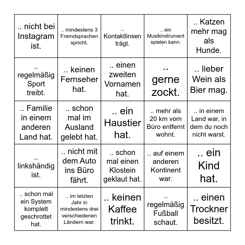 This bingo card has 26 words: .. schon mal einen Klostein geklaut hat., .. regelmäßig Fußball schaut., .. einen zweiten Vornamen hat., .. im letzten Jahr in mindestens drei verschiedenen Ländern war., .. Katzen mehr mag als Hunde., .. nicht bei Instagram ist., .. regelmäßig Sport treibt., .. mindestens 3 Fremdsprachen spricht., .. in einem Land war, in dem du noch nicht warst., .. auf einem anderen Kontinent war., .. gerne zockt., .. Familie in einem anderen Land hat., .. ein Kind hat., .. schon mal ein System komplett geschrottet hat., .. schon mal im Ausland gelebt hat., .. gleich viele Geschwister hat wie du., .. ein Musikinstrument spielen kann., .. linkshändig ist., .. Kontaktlinsen trägt., .. ein Haustier hat., .. lieber Wein als Bier mag., .. keinen Kaffee trinkt., .. mehr als 20 km vom Büro entfernt wohnt., .. nicht mit dem Auto ins Büro fährt., .. keinen Fernseher hat. and .. einen Trockner besitzt..
