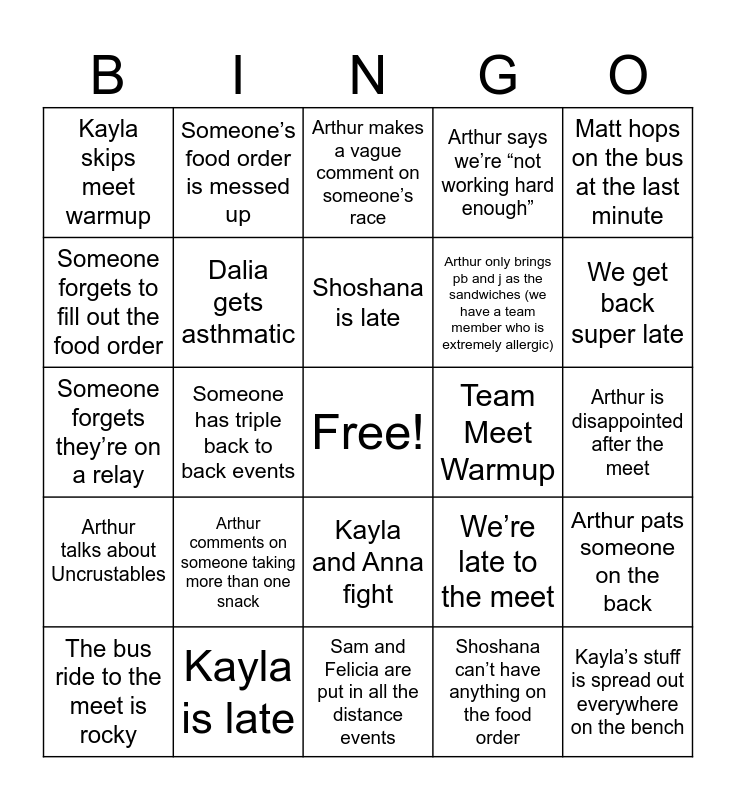 This bingo card has a free space and 24 words: Arthur comments on someone taking more than one snack, Kayla is late, Shoshana is late, The bus ride to the meet is rocky, Matt hops on the bus at the last minute, Kayla skips meet warmup, Someone forgets to fill out the food order, Someone’s food order is messed up, Team Meet Warmup, Kayla and Anna fight, Arthur only brings pb and j as the sandwiches (we have a team member who is extremely allergic), Someone forgets they’re on a relay, We’re late to the meet, Arthur pats someone on the back, Dalia gets asthmatic, Shoshana can’t have anything on the food order, Arthur is disappointed after the meet, Arthur makes a vague comment on someone’s race, We get back super late, Someone has triple back to back events, Kayla’s stuff is spread out everywhere on the bench, Arthur talks about Uncrustables, Arthur says we’re “not working hard enough” and Sam and Felicia are put in all the distance events.