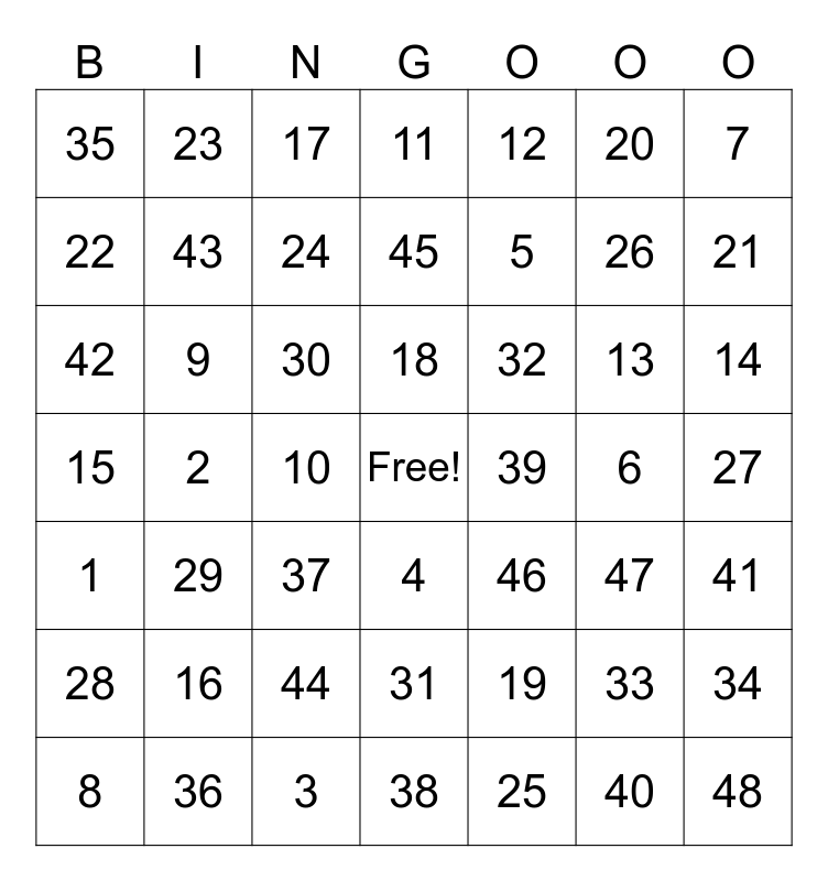 This bingo card has a free space and 48 words: 1, 2, 3, 4, 5, 6, 7, 8, 9, 10, 11, 12, 13, 14, 15, 16, 17, 18, 19, 20, 21, 22, 23, 24, 25, 26, 27, 28, 29, 30, 31, 32, 33, 34, 35, 36, 37, 38, 39, 40, 41, 42, 43, 44, 45, 46, 47 and 48.