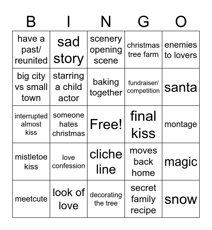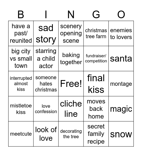 This bingo card has a free space and 24 words: love confession, look of love, baking together, meetcute, enemies to lovers, have a past/ reunited, big city vs small town, sad story, final kiss, cliche line, fundraiser/ competition, interrupted almost kiss, moves back home, magic, starring a child actor, secret family recipe, montage, scenery opening scene, santa, someone hates christmas, snow, mistletoe kiss, christmas tree farm and decorating the tree.