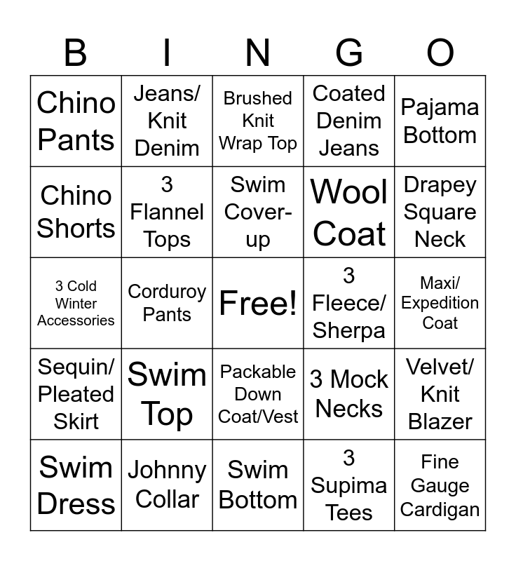 This bingo card has a free space and 25 words: Swim Top, Swim Bottom, Swim Cover-up, Swim Dress, Pajama Bottom, Chino Pants, Chino Shorts, Jeans/ Knit Denim, 3 Fleece/ Sherpa, Packable Down Coat/Vest, Wool Coat, 3 Cold Winter Accessories, 3 Mock Necks, Velvet/ Knit Blazer, 3 Flannel Tops, No-Iron Shirt, Maxi/ Expedition Coat, Brushed Knit Wrap Top, Drapey Square Neck, Corduroy Pants, Fine Gauge Cardigan, Johnny Collar, Sequin/ Pleated Skirt, Coated Denim Jeans and 3 Supima Tees.