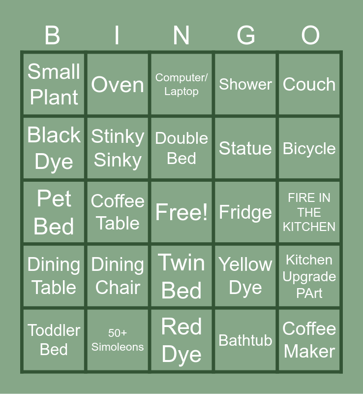 This bingo card has a free space and 39 words: TV, Wall Art, TOILET, Stinky Sinky, Toddler Bed, Twin Bed, Double Bed, Kitchen Counter, Couch, Dining Table, Coffee Table, Shower, Coffee Maker, FIRE IN THE KITCHEN, Fridge, Dining Chair, Bar Stool, Small Plant, LORG PLANT, Yellow Dye, Black Dye, Red Dye, Statue, Bicycle, Stereo, Electronic Upgrade Part, Cozy Chair, Love Seat, Lamp, Oven, Bunk Bed, Desk, Computer/ Laptop, 50+ Simoleons, Bathtub, Bookshelf, Kitchen Upgrade PArt, Pet Bed and Photos.