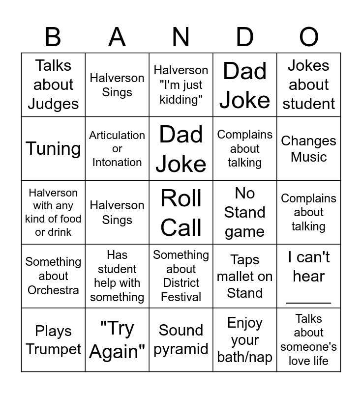 This bingo card has a free space and 24 words: Has student help with something, "Try Again", Dad Joke, Plays Trumpet, Jokes about student, Talks about Judges, Tuning, Halverson Sings, No Stand game, Something about District Festival, Complains about talking, Halverson with any kind of food or drink, Taps mallet on Stand, I can't hear _____, Articulation or Intonation, Enjoy your bath/nap, Complains about talking, Halverson "I'm just kidding", Changes Music, Halverson Sings, Talks about someone's love life, Something about Orchestra, Dad Joke and Sound pyramid.