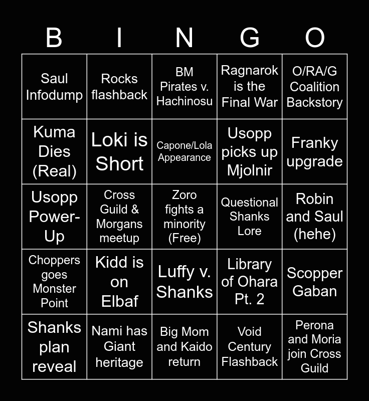 This bingo card has a free space and 24 words: Kidd is on Elbaf, Nami has Giant heritage, Capone/Lola Appearance, Shanks plan reveal, O/RA/G Coalition Backstory, Saul Infodump, Kuma Dies (Real), Rocks flashback, Questional Shanks Lore, Luffy v. Shanks, Usopp picks up Mjolnir, Usopp Power-Up, Library of Ohara Pt. 2, Scopper Gaban, Loki is Short, Void Century Flashback, Robin and Saul (hehe), BM Pirates v. Hachinosu, Franky upgrade, Cross Guild & Morgans meetup, Perona and Moria join Cross Guild, Choppers goes Monster Point, Ragnarok is the Final War and Big Mom and Kaido return.