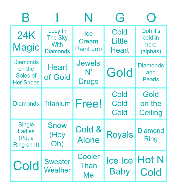 This bingo card has a free space and 43 words: Cold as Ice, Hot N Cold, So Cold, Cold, Cold Water, Ice Ice Baby, Ice Cream Paint Job, Ice Box, Ooh it's cold in here (alphas), Sweater Weather, Cold Little Heart, Cold Cold Cold, Cold & Alone, Snow (Hey Oh), Brrrrrrrr, Cooler Than Me, Fire And Ice, Diamonds, Diamonds Are a Girl's Best Friend, Diamonds and Pearls, Lucy In The Sky With Diamonds, Gold Digger, 7 rings, 24K Magic, Chain Hang Low, Gold on the Ceiling, Gold Dust Woman, Paper Rings, Royals, Single Ladies (Put a Ring on It), Silver and Gold, Diamond Ring, Grillz, Titanium, JEWELZ, Diamonds Are Forever, First Chain, Jewels N' Drugs, Diamonds on the Soles of Her Shoes, Gold, Ring of Fire, Heart of Gold and Cold Heart.