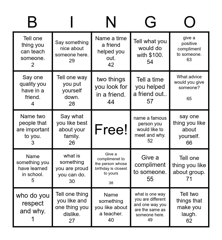 This bingo card has a free space and 24 words: who do you respect and why. 1, what is something you are proud you can do. 30, two things you look for in a friend. 44, what is one way you are different and one way you are the same as someone here. 49, give a positive compliment to someone. 63, Tell one thing you can teach someone. 2, Say something nice about someone here. 29, Name a time a friend helped you out. 42, name a famous person you would like to meet and why. 52, say one thing you like about yourself. 66, Name two people that are important to you. 3, Tell one way you put yourself down. 28, Give a compliment to someone. 55, Tell one thing you like about group. 71, Say one quality you have in a friend. 4, Tell one thing you like and one thing you dislike. 27, Name something you like about a teacher. 40, Tell what you would do with $100. 54, What advice would you give someone? 65, Name something you have learned in school. 5, Say what you like best about your family. 26, Give a complimenet to the person whose birthday is closest to yours 38, Tell a time you helped a friend out.. 57 and Tell two things that make you laugh. 62.