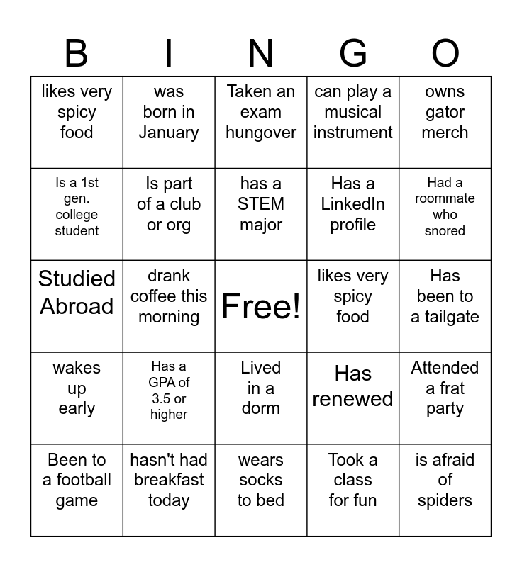 This bingo card has a free space and 24 words: Has a GPA of 3.5 or higher, hasn't had breakfast today, has a STEM major, Been to a football game, owns gator merch, likes very spicy food, Is a 1st gen. college student, was born in January, likes very spicy food, Lived in a dorm, Has a LinkedIn profile, Studied Abroad, Has renewed, Attended a frat party, Is part of a club or org, Took a class for fun, Has been to a tailgate, Taken an exam hungover, Had a roommate who snored, drank coffee this morning, is afraid of spiders, wakes up early, can play a musical instrument and wears socks to bed.