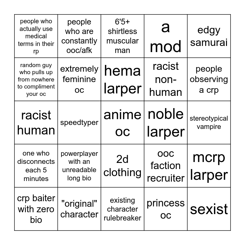 This bingo card has a free space and 24 words: crp baiter with zero bio, powerplayer with an unreadable long bio, hema larper, princess oc, edgy samurai, people who actually use medical terms in their rp, people who are constantly ooc/afk, 6'5+ shirtless muscular man, noble larper, stereotypical vampire, racist human, extremely feminine oc, ooc faction recruiter, mcrp larper, random guy who pulls up from nowhere to compliment your oc, "original" character, existing character rulebreaker, a mod, people observing a crp, one who disconnects each 5 minutes, speedtyper, 2d clothing, racist non-human and sexist.