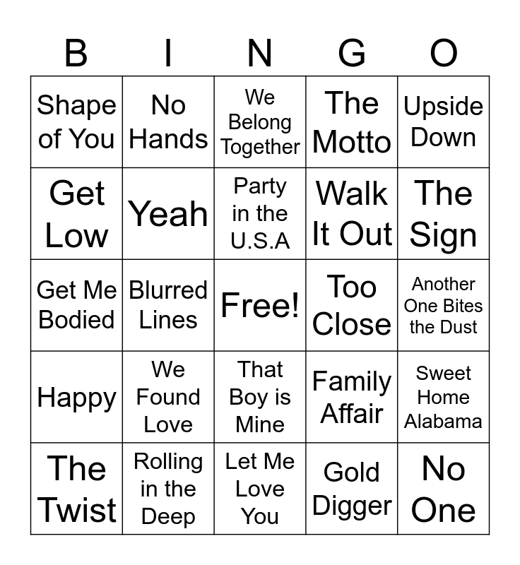 This bingo card has a free space and 29 words: The Twist, Uptown Funk, Blurred Lines, Macerena, Shape of You, We Belong Together, Yeah, We Found Love, Too Close, Rolling in the Deep, Another One Bites the Dust, No One, Let Me Love You, Gold Digger, The Sign, Woomp (There It Is), That Boy is Mine, Happy, Upside Down, Get Me Bodied, Family Affair, Billie Jean, Walk It Out, Get Low, The Motto, No Hands, Sweet Home Alabama, Party in the U.S.A and No Woman, No Cry.