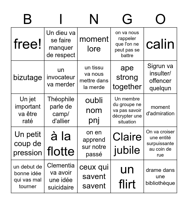 This bingo card has a free space and 27 words: Claire jubile, Un pnj ne va pas donner son nom, ape strong together, ceux qui savent savent, bizutage, moment lore, Un dieu va se faire manquer de respect, Un petit coup de pression, Un membre du groupe ne va pas savoir décrypter une situation, On va croiser une entité surpuissante au coin de rue, Un jet important va être raté, on va nous rappeler que l'on ne peut pas se battre, un debut de bonne idée qui vas mal tourner, Clementia va avoir une idée suicidaire, Sigrun va insulter/ offencer quelqun, Copine clodos, un invocateur va merder, un tissu va nous mettre dans la merde, à la flotte, free!, moment d'admiration, un flirt, Théophile parle de camp/ d'allier, drame dans une bibliothèque, on en apprend sur notre passé, calin and parallèle autre timeline.