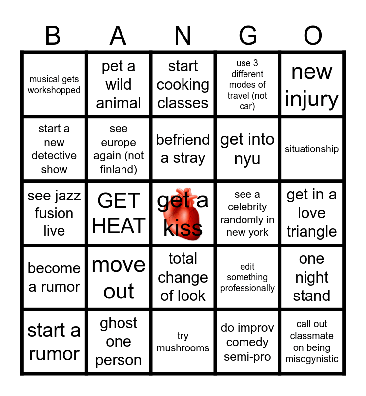 This bingo card has a free space and 24 words: move out, ghost one person, befriend a stray, start a rumor, new injury, musical gets workshopped, start a new detective show, pet a wild animal, see a celebrity randomly in new york, total change of look, get into nyu, see jazz fusion live, edit something professionally, one night stand, see europe again (not finland), do improv comedy semi-pro, get in a love triangle, start cooking classes, situationship, GET HEAT, call out classmate on being misogynistic, become a rumor, use 3 different modes of travel (not car) and try mushrooms.