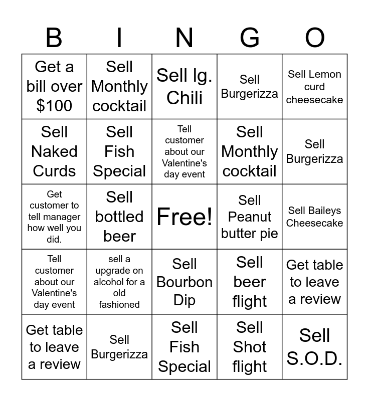 This bingo card has a free space and 29 words: Get table to leave a review, Sell Burgerizza, Sell bottled beer, Sell Watermelon Limeade, Get a bill over $100, Sell lg. Chili, Sell Fish Special, sell a upgrade on alcohol for a old fashioned, Sell Peanut butter pie, Sell Burgerizza, Sell Baileys Cheesecake, Sell S.O.D., Sell Fish Special, Sell Shot flight, Sell Burgerizza, Sell monthly cocktails, Sell Bourbon Dip, Tell customer about our Valentine's day event, Sell Lemon curd cheesecake, Get customer to tell manager how well you did., Sell beer flight, Sell Fish special, Sell Monthly cocktail, Sell Naked Curds, Sell Burgerizza, Sell Monthly cocktail, Get table to leave a review, Tell customer about our Valentine's day event and Sell Watermelon Limeade.