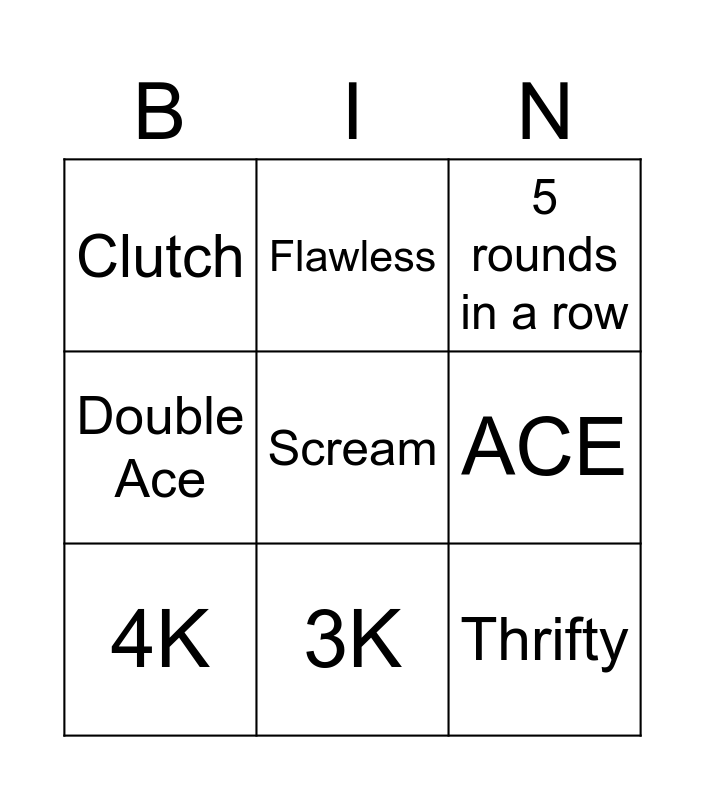 This bingo card has a free space and 8 words: ACE, 5 rounds in a row, Flawless, 4K, Clutch, Thrifty, Double Ace and 3K.