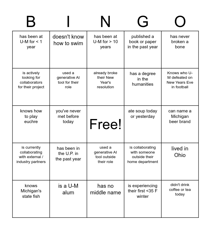 This bingo card has a free space and 24 words: has been in the U.P. in the past year, is a U-M alum, already broke their New Year's resolution, knows Michigan's state fish, has never broken a bone, has been at U-M for < 1 year, is actively looking for collaborators for their project, doesn't know how to swim, ate soup today or yesterday, used a generative AI tool outside their role, has a degree in the humanities, knows how to play euchre, is collaborating with someone outside their home department, lived in Ohio, used a generative AI tool for their role, is experiencing their first <35 F winter, can name a Michigan beer brand, has been at U-M for > 10 years, Knows who U-M defeated on New Years Eve in football, you've never met before today, didn't drink coffee or tea today, is currently collaborating with external / industry partners, published a book or paper in the past year and has no middle name.