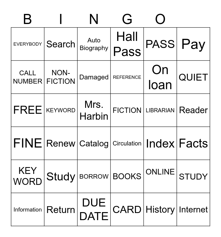 This bingo card has 36 words: BOOKS, BORROW, CARD, CALL NUMBER, FINE, FICTION, NON-FICTION, DUE DATE, PASS, ONLINE, QUIET, Hall Pass, STUDY, KEYWORD, REFERENCE, EVERYBODY, KEY WORD, LIBRARIAN, FREE, Auto Biography, Mrs. Harbin, Renew, Circulation, Catalog, Index, Search, On loan, Return, Damaged, Pay, Internet, Information, Facts, Reader, Study and History.