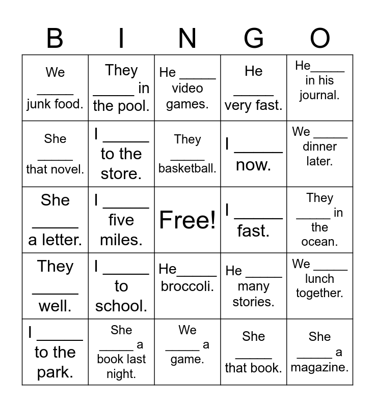 This bingo card has a free space and 24 words: I _____ to school., She _____ a book last night., They _____ basketball., I _____ to the park., He_____ in his journal., We _____ junk food., She _____ that novel., They _____ in the pool., I _____ fast., He_____ broccoli., I _____ now., She _____ a letter., He _____ many stories., We _____ lunch together., I _____ to the store., She _____ that book., They _____ in the ocean., He _____ video games., We _____ dinner later., I _____ five miles., She _____ a magazine., They _____ well., He _____ very fast. and We _____ a game..