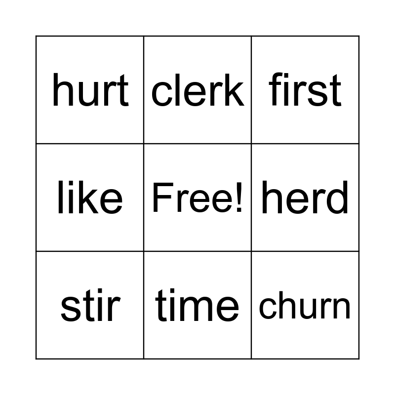 This bingo card has a free space and 8 words: herd, first, clerk, stir, hurt, churn, like and time.