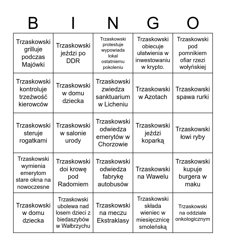 This bingo card has 25 words: Trzaskowski doi krowę pod Radomiem, Trzaskowski na meczu Ekstraklasy, Trzaskowski zwiedza sanktuarium w Licheniu, Trzaskowski w domu dziecka, Trzaskowski pod pomnikiem ofiar rzezi wołyńskiej, Trzaskowski grilluje podczas Majówki, Trzaskowski kontroluje trzeźwość kierowców, Trzaskowski jeździ po DDR, Trzaskowski jeździ koparką, Trzaskowski odwiedza fabrykę autobusów, Trzaskowski w Azotach, Trzaskowski steruje rogatkami, Trzaskowski na Wawelu, Trzaskowski kupuje burgera w maku, Trzaskowski w domu dziecka, Trzaskowski na oddziale onkologicznym, Trzaskowski łowi ryby, Trzaskowski protestuje wypowiada lokal ostatniemu pokoleniu, Trzaskowski spawa rurki, Trzaskowski w salonie urody, Trzaskowski odwiedza emerytów w Chorzowie, Trzaskowski ubolewa nad losem dzieci z biedaszybów w Wałbrzychu, Trzaskowski wymienia emerytom stare okna na nowoczesne, Trzaskowski obiecuje ułatwienia w inwestowaniu w krypto. and Trzaskowski składa wieniec w miesięcznicę smoleńską.