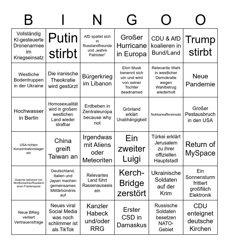This bingo card has 37 words: Ukrainische Soldaten auf der Krim, Kerch-Bridge zerstört, Russische Soldaten besetzen NATO-Gebiet, Westliche Bodentruppen in der Ukraine, China greift Taiwan an, Nuklearwaffeneinsatz, Die iranische Theokratie wird gestürzt, Erster CSD in Damaskus, CDU & AfD koalieren in Bund/Land, Neue BReg verliert Vertrauensfrage, Neue Pandemie, Großer Hurricane in Europa, Hochwasser in Berlin, Erdbeben in Zentraleuropa because why not, Trump stirbt, Grönland erklärt Unabhängigkeit, Deutschland, Italien und Japan machen gemeinsames Militärbündnis auf, AfD spaltet sich in Russlandfreunde und „wahre Patrioten“, Großer Pestausbruch in den USA, Homosexualität wird in großem westlichen Land wieder strafbar, Vollständig KI-gesteuerte Dronenarmee im Kriegseinsatz, Elon Musk benennt sich um und wird von seiner Tochter deadnamed, Irgendwas mit Aliens oder Meteoriten, Türkei erklärt Jerusalem zu ihrer offiziellen Hauptstadt, Neues viral Social Media was noch schlimmer ist als TikTok, Return of MySpace, Putin stirbt, Kanzler Habeck und/oder RRG, Ein Sonnensturm frittiert großfläch Elektronik, Relevantes Land führt Rassenausweis ein, Papst spricht sich für Atomkraft aus, Ein zweiter Luigi, Relevante Wahl in westlicher Demokratie wegen Wahlbetrug wiederholt, Guterres bekommt von Nordkorea/Iran/Russland einen Friedenspreis, USA richten Konzentrationslager ein, Bürgerkrieg im Libanon and CDU enteignet deutsche Kirchen.