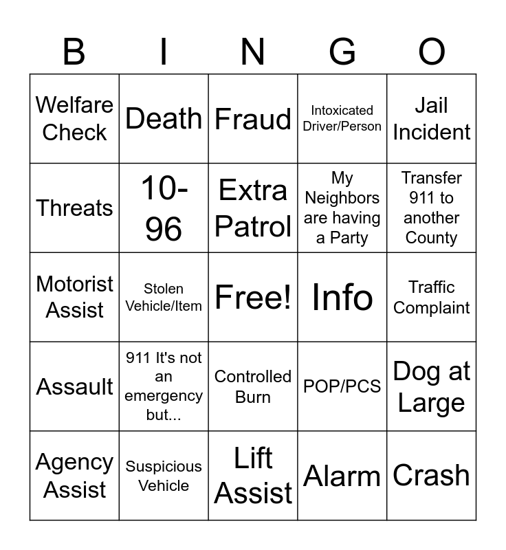 This bingo card has a free space and 35 words: Ordinance Violation, Open Door, Angry/Rude Caller, 10-96, Controlled Burn, Intoxicated Driver/Person, Threats, BabyMama Drama, Extra Patrol, Reckless Driver, Motorist Assist, Jail Incident, Missing Person/Runaway, 911 Hangup, Welfare Check, Info, Alarm, Stolen Vehicle/Item, Assault, Crash, POP/PCS, Agency Assist, Dog at Large, Suspicious Vehicle, Fraud, Transfer 911 to another County, Animal Complaint, Suspicious Circumstance, My Neighbors are having a Party, Traffic Complaint, Structure Fire, Lift Assist, 911 It's not an emergency but..., Death and Ambulance.
