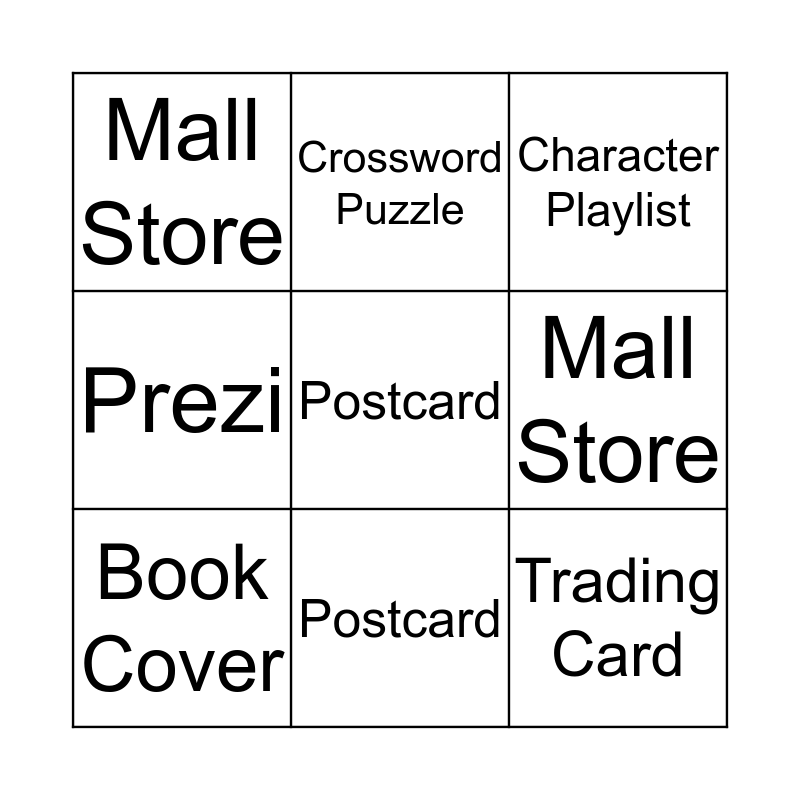 ⚠ This card has duplicate items: Trading Card (2), Story Cube (2), Character Playlist (2), Mall Store (2), Book Cover (2), Prezi (2), Facebook Profile (2), Crossword Puzzle (2), Postcard (2)