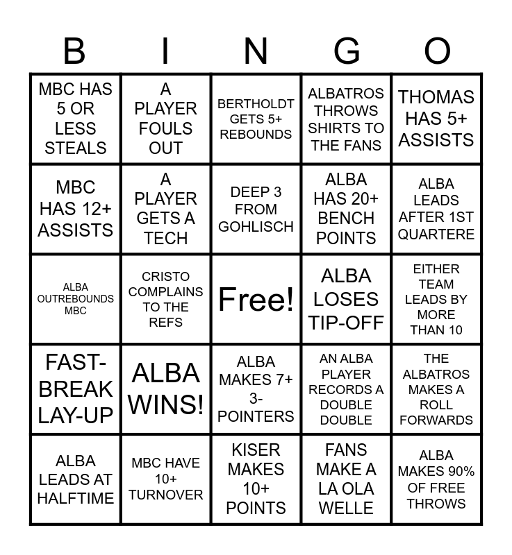 This bingo card has a free space and 24 words: ALBA WINS!, MBC HAVE 10+ TURNOVER, DEEP 3 FROM GOHLISCH, ALBA LEADS AT HALFTIME, THOMAS HAS 5+ ASSISTS, MBC HAS 5 OR LESS STEALS, MBC HAS 12+ ASSISTS, A PLAYER FOULS OUT, ALBA LOSES TIP-OFF, ALBA MAKES 7+ 3-POINTERS, ALBA HAS 20+ BENCH POINTS, ALBA OUTREBOUNDS MBC, AN ALBA PLAYER RECORDS A DOUBLE DOUBLE, THE ALBATROS MAKES A ROLL FORWARDS, A PLAYER GETS A TECH, FANS MAKE A LA OLA WELLE, EITHER TEAM LEADS BY MORE THAN 10, BERTHOLDT GETS 5+ REBOUNDS, ALBA LEADS AFTER 1ST QUARTERE, CRISTO COMPLAINS TO THE REFS, ALBA MAKES 90% OF FREE THROWS, FAST-BREAK LAY-UP, ALBATROS THROWS SHIRTS TO THE FANS and KISER MAKES 10+ POINTS.