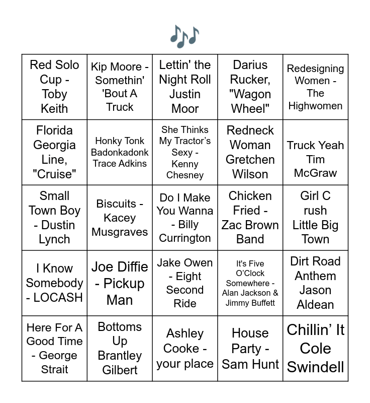 This bingo card has 35 words: That Don't Impress Me Much - Shania Twain, Up Down Morgan Wallen, Life Is A Highway - Rascal Flatts, Honky Tonk Badonkadonk Trace Adkins, Jake Owen - Eight Second Ride, Darius Rucker, "Wagon Wheel", Florida Georgia Line, "Cruise", Country Girl (Shake It For Me) - Luke Bryan, She Thinks My Tractor’s Sexy - Kenny Chesney, Dime Store Cowgirl - Kacey Musgraves, Small Town Boy - Dustin Lynch, Redesigning Women - The Highwomen, Save a Horse (Ride a Cowboy) Song by Big & Rich, Craving You - Thomas Rhett and Marin Morris, Red Solo Cup - Toby Keith, Chicken Fried - Zac Brown Band, House Party - Sam Hunt, Biscuits - Kacey Musgraves, I Know Somebody - LOCASH, Do I Make You Wanna - Billy Currington, It's Five O’Clock Somewhere - Alan Jackson & Jimmy Buffett, Here For A Good Time - George Strait, Dirt Road Anthem Jason Aldean, Bottoms Up Brantley Gilbert, Lettin' the Night Roll Justin Moor, Truck Yeah Tim McGraw, Chillin’ It Cole Swindell, Strawberry Wine Deana Carter, Redneck Woman Gretchen Wilson, Girl Crush Little Big Town, Lainey Wilson - 4x4xU, Ashley Cooke - your place, Joe Diffie - Pickup Man, Kip Moore - Somethin' 'Bout A Truck and Chase McDaniel - Drop Your Tailgate.