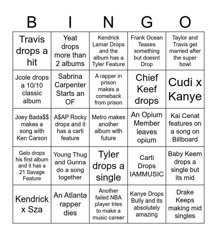 This bingo card has 25 words: Young Thug and Gunna do a song together, Another failed NBA player tries to make a music career, A rapper in prison makes a comeback from prison, Kendrick x Sza, Taylor and Travis get married after the super bowl, Travis drops a hit, Jcole drops a 10/10 classic album, Yeat drops more than 2 albums, An Opium Member leaves opium, Tyler drops a single, Chief Keef drops, Joey Bada$$ makes a song with Ken Carson, Carti Drops IAMMUSIC, Baby Keem drops a single but its mid, Sabrina Carpenter Starts an OF, Drake Keeps making mid singles, Kai Cenat features on a song on Billboard, Kendrick Lamar Drops and the album has a Tyler Feature, Cudi x Kanye, A$AP Rocky drops and it has a carti feature, Metro makes another album with future, An Atlanta rapper dies, Gelo drops his first album and it has a 21 Savage Feature, Frank Ocean Teases something but doesnt Drop and Kanye Drops Bully and its absolutely amazing.