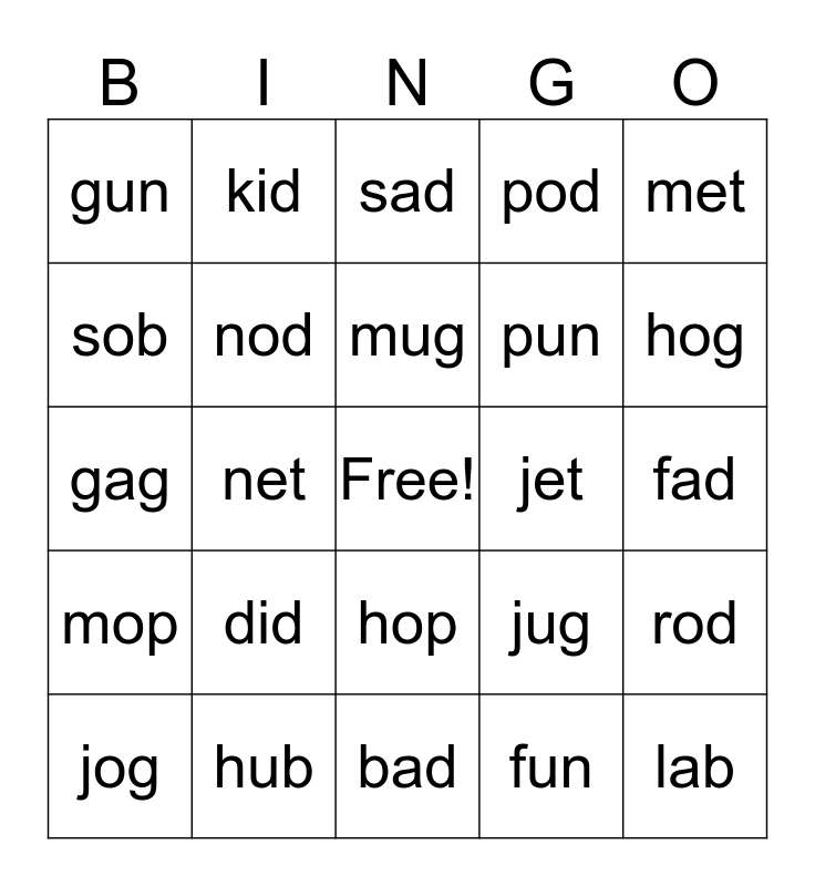 This bingo card has a free space and 48 words: cab, lab, tab, bad, did, hid, kid, lid, sob, cod, nod, pod, rod, jug, rug, tug, mug, jet, let, met, net, fun, gun, pun, run, hog, jog, log, hop, mop, pop, top, cot, cub, hub, rub, dad, fad, lad, had, mad, pad, sad, bag, gag, lag, rag and sag.