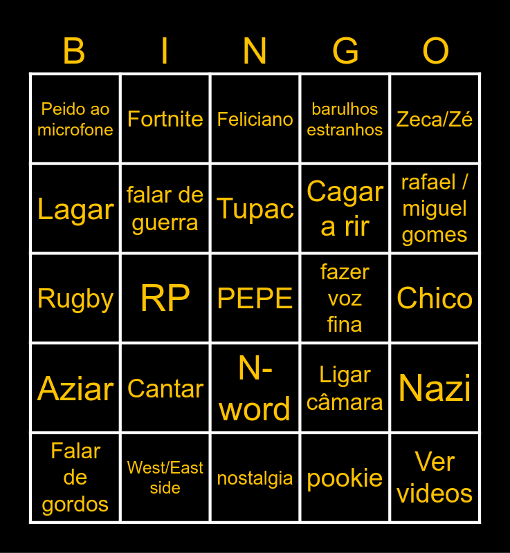 This bingo card has a free space and 24 words: Cantar, West/East side, Tupac, Falar de gordos, Zeca/Zé, Peido ao microfone, Lagar, Fortnite, fazer voz fina, N-word, Cagar a rir, Rugby, Ligar câmara, Nazi, falar de guerra, pookie, Chico, Feliciano, rafael / miguel gomes, RP, Ver videos, Aziar, barulhos estranhos and nostalgia.