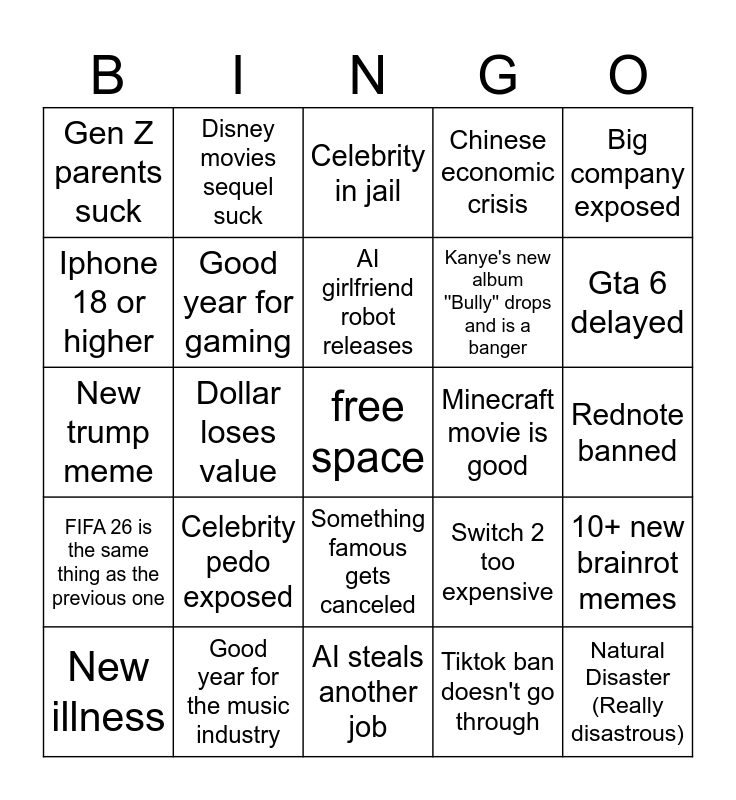 This bingo card has a free space and 24 words: Celebrity pedo exposed, Good year for the music industry, AI girlfriend robot releases, New illness, Big company exposed, Gen Z parents suck, Iphone 18 or higher, Disney movies sequel suck, Minecraft movie is good, Something famous gets canceled, Kanye's new album ''Bully'' drops and is a banger, New trump meme, Switch 2 too expensive, 10+ new brainrot memes, Good year for gaming, Tiktok ban doesn't go through, Rednote banned, Celebrity in jail, Gta 6 delayed, Dollar loses value, Natural Disaster (Really disastrous), FIFA 26 is the same thing as the previous one, Chinese economic crisis and AI steals another job.