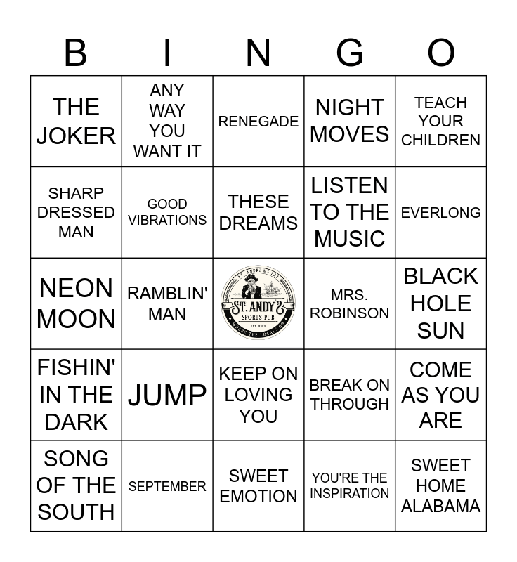 This bingo card has a free space and 50 words: DON'T DO ME LIKE THAT, SWEET HOME ALABAMA, TAKE IT EASY, SWEET EMOTION, JUMP, SWEET CHILD O' MINE, ANY WAY YOU WANT IT, ENTER SANDMAN, SHARP DRESSED MAN, BAD MOON RISING, GOOD VIBRATIONS, NIGHT MOVES, COME AS YOU ARE, BREAK ON THROUGH, SNOW (HEY OH), ALIVE, THESE DREAMS, MRS. ROBINSON, ITS MY LIFE, TEACH YOUR CHILDREN, RAMBLIN' MAN, YOU'RE THE INSPIRATION, THE JOKER, LISTEN TO THE MUSIC, MORE THAN A FEELING, DRIVE, EVERLONG, MY GIRL, RENEGADE, KEEP ON LOVING YOU, REELIN' IN THE YEARS, ROCK AND ROLL ALL NITE, GIRLS, GIRLS, GIRLS, CARRY ON WAYWARD SON, SEPTEMBER, CASEY JONES, HEART OF GLASS, BABY LOVE, SURRENDER, BLACK HOLE SUN, LOSING MY RELIGION, BASKET CASE, ONE, CREEP, SONG OF THE SOUTH, NEON MOON, YOU MAKE MY DREAMS, BLITZKRIEG BOP, FISHIN' IN THE DARK and THE POWER OF LOVE.