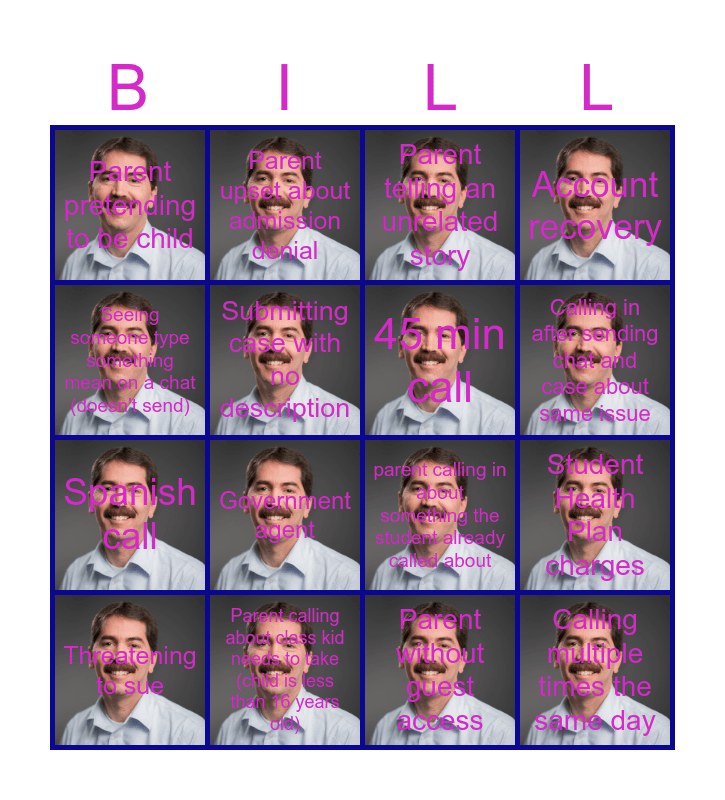 This bingo card has 21 images and 21 words: Parent calling about class kid needs to take (child is less than 16 years old), Restricted account, Parent upset about admission denial, Missing the deadline, Parent without guest access, 45 min call, Parent pretending to be child, Parent telling an unrelated story, parent calling in about something the student already called about, Calling in after sending chat and case about same issue, Spanish call, Account recovery, Calling multiple times the same day, Sending transcript on deadline, Submitting case with no description, Wanting to order an unofficial transcript, Threatening to sue, Government agent, Seeing someone type something mean on a chat (doesn't send), Student Health Plan charges and Scholarship requirements.
