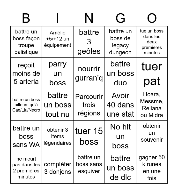 This bingo card has a free space and 24 words: obtenir 3 items légendaires, compléter 3 donjons, nourrir gurran'q, ne meurt pas dans les 2 premières minutes, tue un boss dans les deux premières minutes, battre un boss façon troupe balistique, reçoit moins de 5 arteria, Amélio +5/+12 un équipement, Avoir 40 dans une stat, tuer 15 boss, battre un boss duo, battre un boss ailleurs qu'à Cae/Liu/Nécro, No hit un boss, obtenir un souvenir, parry un boss, battre un boss de dlc, Hoara, Messme, Rellana ou Midra, battre 3 geôles, tuer pat, battre un boss tout nu, gagner 50 k runes en une fois, battre un boss sans WA, battre un boss de legacy dungeon and battre un boss sans esquiver.