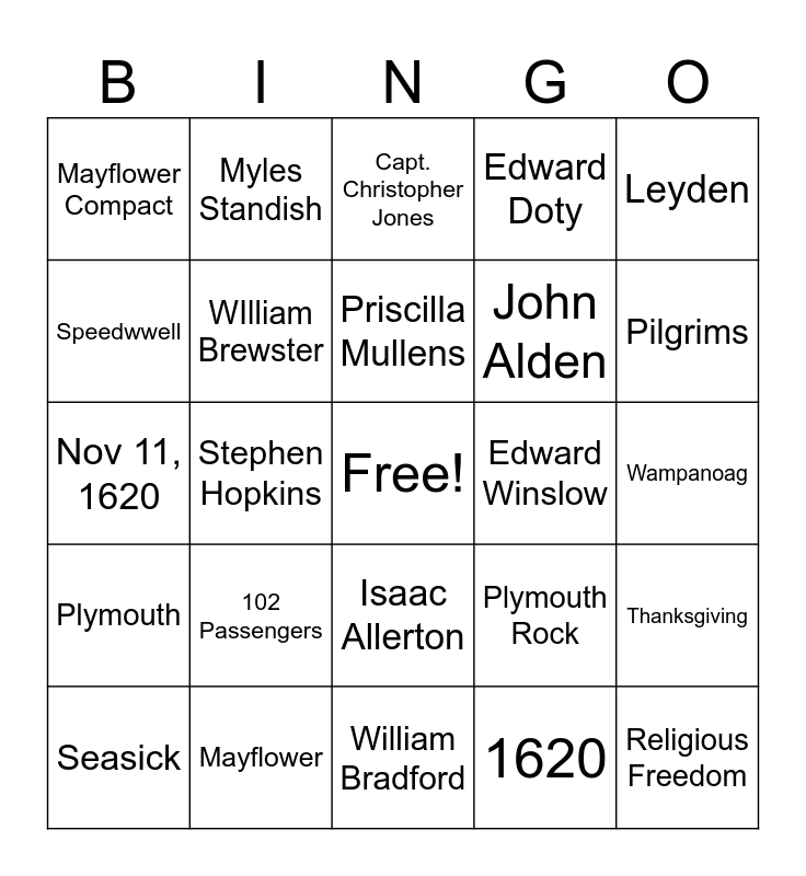 This bingo card has a free space and 25 words: Plymouth, Mayflower, William Bradford, 1620, Leyden, Mayflower Compact, Myles Standish, Capt. Christopher Jones, Edward Winslow, Thanksgiving, Speedwwell, WIlliam Brewster, Francis Cooke, Plymouth Rock, Pilgrims, Seasick, Stephen Hopkins, Priscilla Mullens, John Alden, Wampanoag, Nov 11, 1620, 102 Passengers, Isaac Allerton, Edward Doty and Religious Freedom.